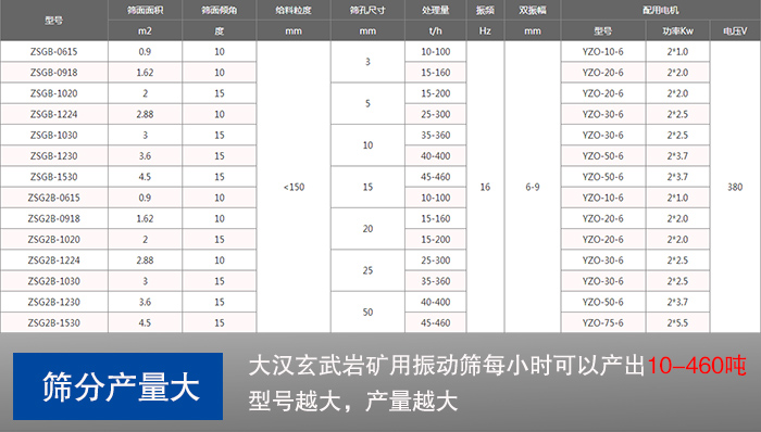 針對玄武巖篩分而言,篩分產(chǎn)量往往是放在一位的,大漢玄武巖礦用振動篩每小時可以產(chǎn)出10-460噸的玄武巖成品,設(shè)備型號齊全,不同產(chǎn)量選擇的礦用振動篩型號不同,產(chǎn)量越大,選擇的礦用振動篩型號自然也是越大的。